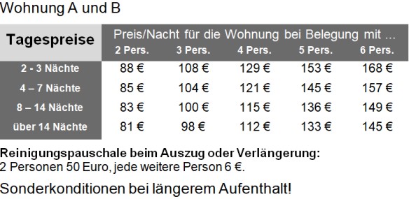 Preise incl. Parkplatz, Bettwäsche, Handtücher und aller sonstigen Kosten (TV, Internet...)